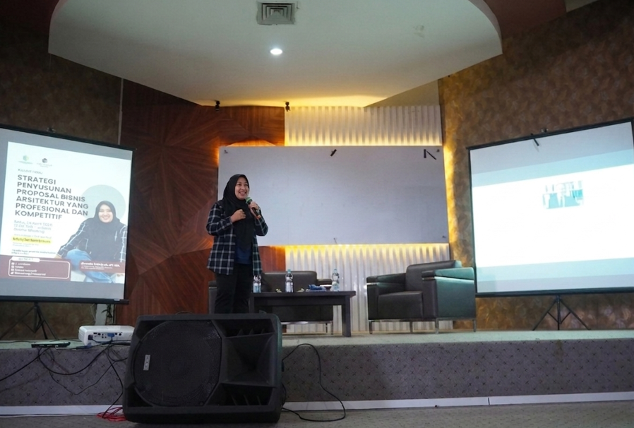 Dalam sesi penyampaian materi, Aramia Fahriyah menjelaskan bahwa penyusunan proposal bisnis arsitektur harus memperhatikan aspek teknis, estetika, dan keberlanjutan. Ia juga menegaskan bahwa proposal yang baik tidak hanya berisi gambar desain, tetapi juga analisis kebutuhan pasar dan kelayakan proyek. Mahasiswa diberikan contoh kasus nyata untuk memahami bagaimana proposal bisnis disusun secara sistematis dan profesional. Selain itu, narasumber juga membahas tantangan yang sering dihadapi oleh arsitek muda dalam memasuki dunia usaha. Peserta diajak berdiskusi mengenai strategi menghadapi persaingan industri arsitektur yang semakin kompetitif. Dalam kesempatan tersebut, mahasiswa juga diberikan ruang untuk bertanya secara langsung kepada narasumber. Suasana diskusi berlangsung interaktif dan penuh semangat.