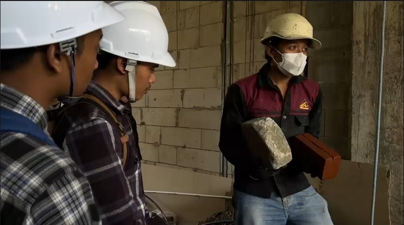 Pada kegiatan ini, mahasiswa melakukan praktikum teknik masonry yang mencakup penggunaan bata merah dan bata ringan. Mereka diajarkan cara menyusun bata dengan benar serta memahami perbedaan karakteristik masing-masing material. Selain itu, mahasiswa juga mempelajari teknik konstruksi beton bertulang, mulai dari pembuatan tulangan hingga proses bekisting. Proses pencampuran adukan beton dengan mutu yang sesuai juga menjadi bagian penting dalam praktikum ini. Melalui pengalaman langsung, mahasiswa dapat melihat bagaimana kualitas pekerjaan sangat dipengaruhi oleh ketelitian dan teknik yang digunakan. Tidak hanya itu, mereka juga dikenalkan pada konsep struktur rigid frame beton bertulang. Struktur ini merupakan salah satu sistem yang umum digunakan pada bangunan sederhana 1–2 lantai karena kekuatannya dalam menahan beban.