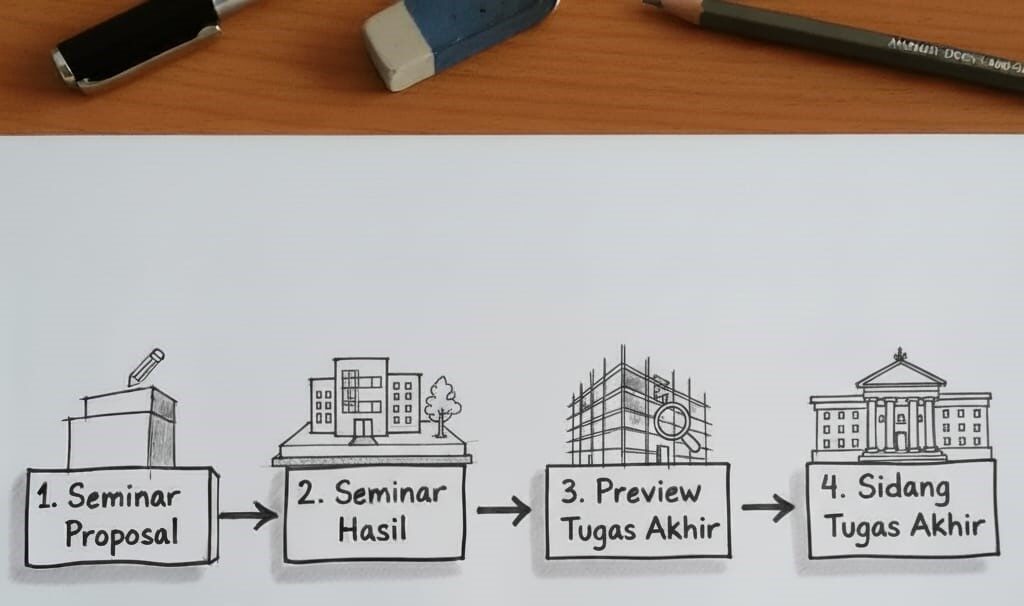 Program Studi Arsitektur UIN Malang mengadakan ujian seminar hasil semester ganjil Tahun Akademik 2025/2026 yang berlangsung dari tanggal 17 November hingga 28 November. Kegiatan akademik ini diikuti oleh 106 mahasiswa yang sedang menjalani tahap akhir penyusunan penelitian. Seminar hasil tersebut dilaksanakan di ruang-ruang program studi yang telah disiapkan untuk kegiatan akademik. Tujuan pelaksanaan seminar ini adalah untuk menilai sejauh mana mahasiswa mampu memaparkan perkembangan perancangannya. Pihak program studi menyampaikan bahwa seluruh persiapan telah dilakukan agar proses ujian berjalan tertib dan lancar.